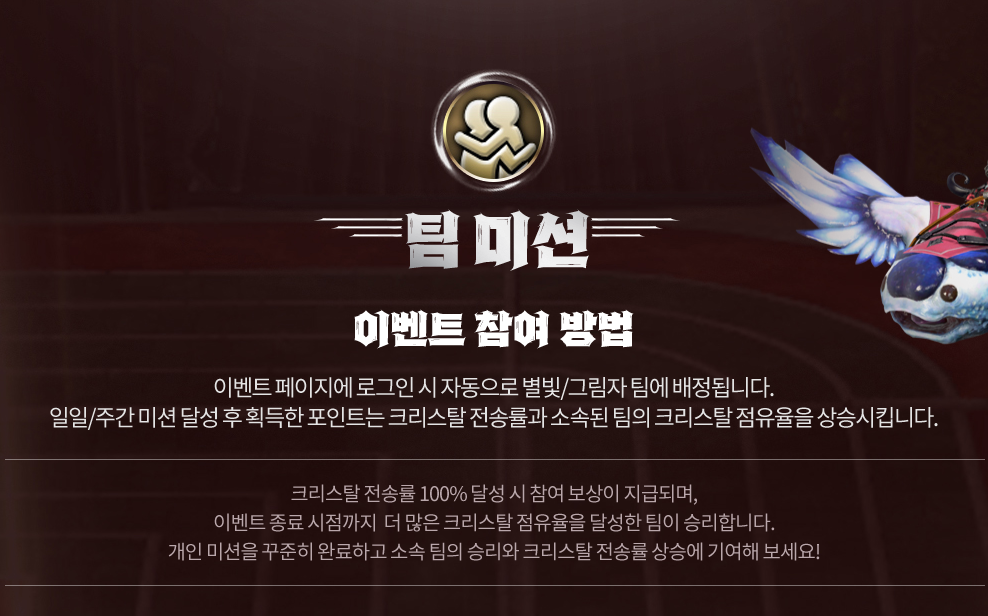일일/주간 미션 달성 후 획득한 포인트는 크리스탈 전송률과 소속된 팀의 크리스탈 점유율을 상승시킵니다.