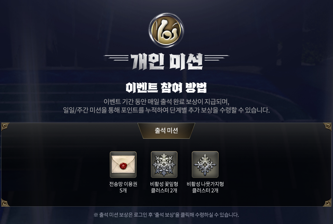 이벤트 기간 동안 매일 출석 완료 보상이 지급되며,