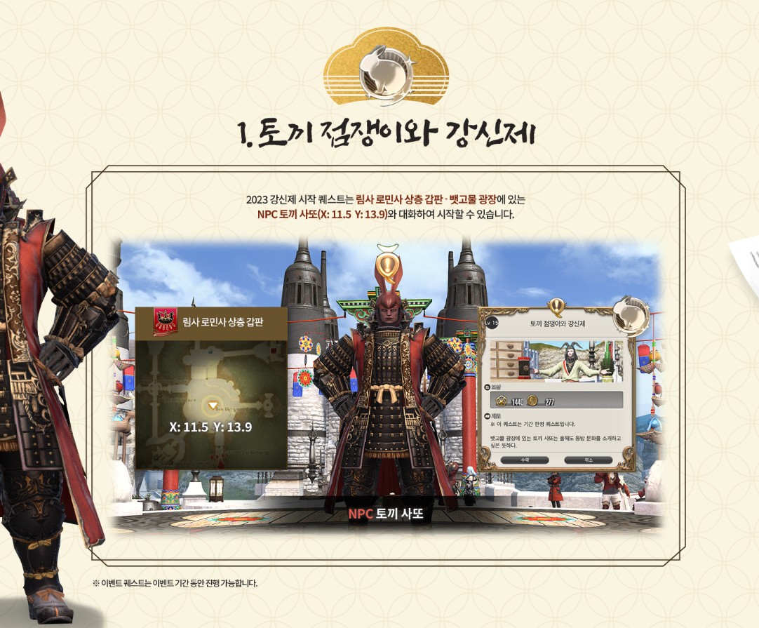 NPC 동방의 점쟁이를 도와 이벤트 퀘스트를 완료하고 올해의 운세를 점쳐보세요.