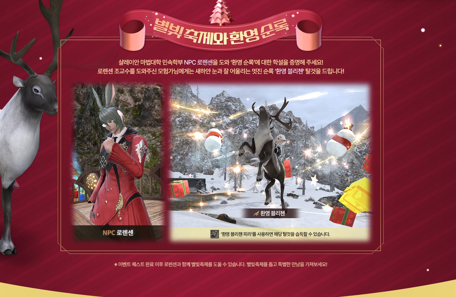 로렌센 조교수를 도와주신 모험가님에게는 새하얀 눈과 잘 어울리는 멋진 순록 '환영 블리첸' 탈것을 드립니다!
